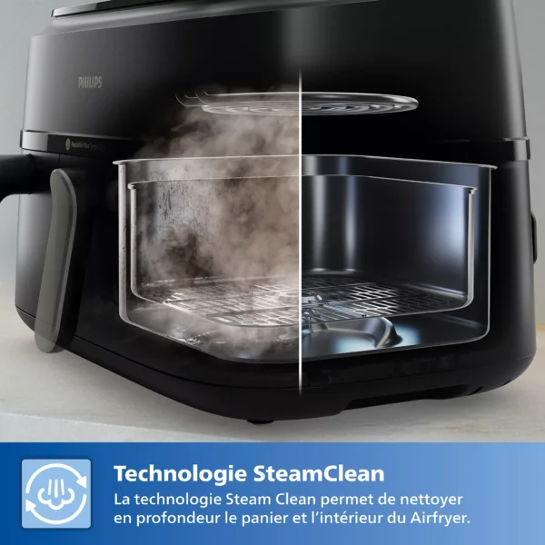 Cette technologie est idéale pour les légumes, poissons, raviolis et bien plus encore, garantissant des aliments tendres sans être gorgés d’eau. De plus, la fonction Steam Clean facilite le nettoyage en profondeur du grand panier, éliminant facilement les graisses déposées autour du tube de chauffe.
