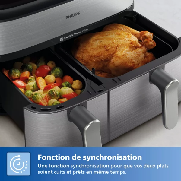 La fonction synchronisation de l’Airfryer PHILIPS Série 5000 permet de synchroniser automatiquement les temps de cuisson dans les deux paniers, assurant que vos plats soient prêts simultanément.