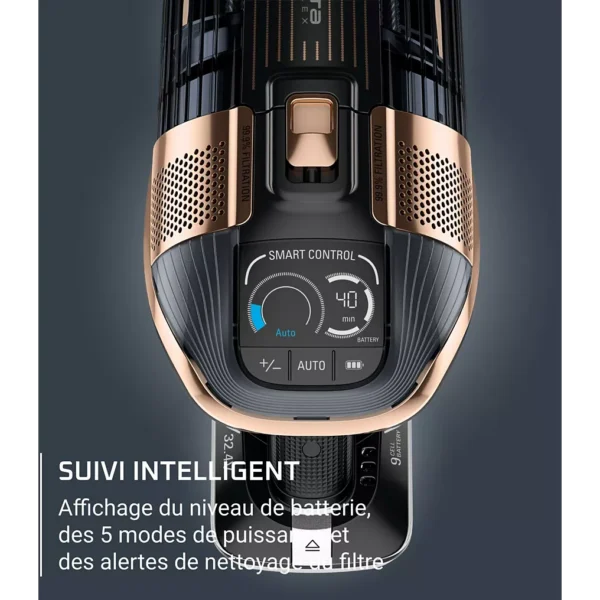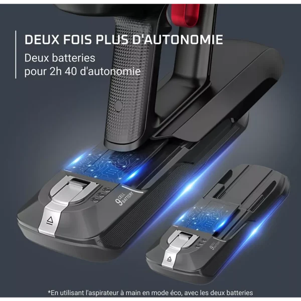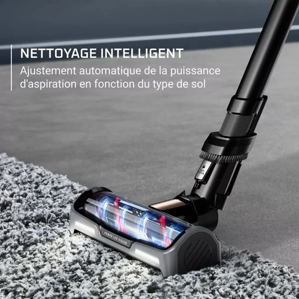 Cette innovation, associée à un éclairage LED puissant situé sur la tête d’aspiration, permet de visualiser la poussière cachée et d’assurer un nettoyage complet, même dans les zones sombres. Cette caractéristique améliore nettement le confort d’utilisation et garantit un résultat impeccable.