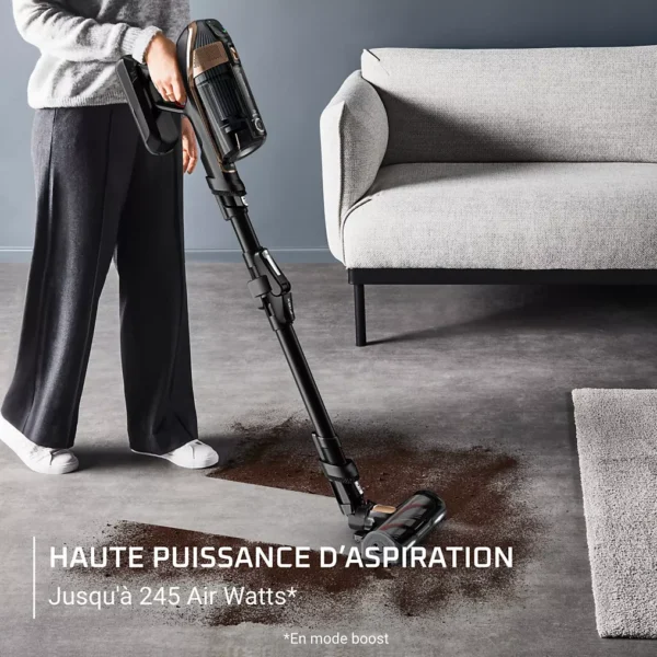 Cette puissance se décline en plusieurs modes d’aspiration permettant d’adapter l’intensité selon la nature du sol et le degré de saleté. Le mode boost garantit une efficacité redoutable sur les zones très encrassées, tandis que les modes intermédiaires assurent un nettoyage précis et économe pour les surfaces délicates.