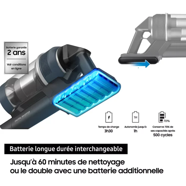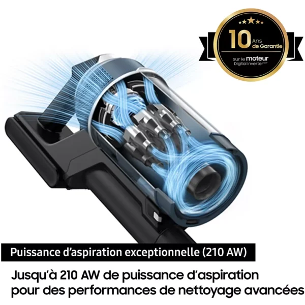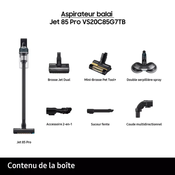 Sur le marché des aspirateurs sans fil, le SAMSUNG Jet 85 Pro VS20C85G7TB se démarque par :