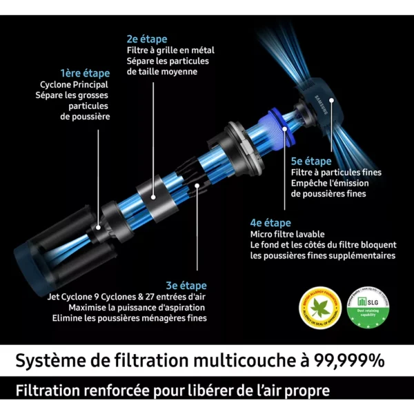 L’un des atouts majeurs du SAMSUNG Jet 85 Pro VS20C85G7TB réside dans son système de filtration avancé. Grâce à un dispositif multicouche, il piège jusqu’aux particules les plus fines, améliorant ainsi la qualité de l’air intérieur.