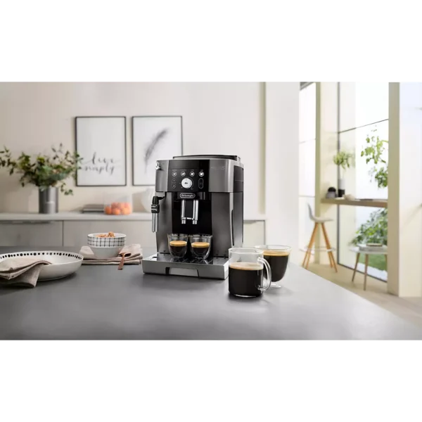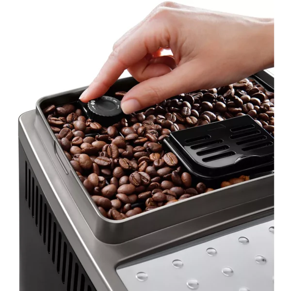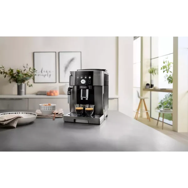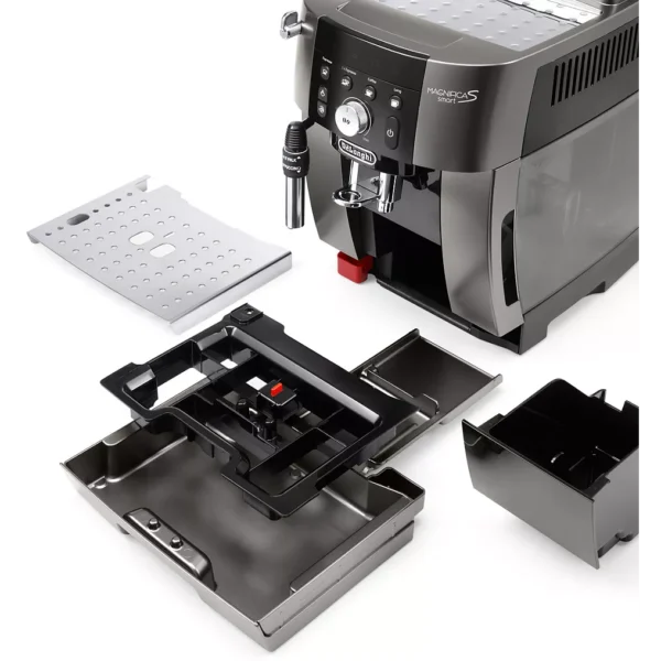 Le DELONGHI Magnifica S Smart FEB2533.TB arbore une finition élégante avec sa façade Titane/Noir, lui donnant un aspect moderne et sobre qui s’adapte parfaitement à toutes les cuisines. Son format compact permet de l’intégrer facilement sur un plan de travail même restreint, tout en offrant un accès pratique à tous ses éléments : bac à graines, réservoir d’eau, panneau de commande et buse vapeur.