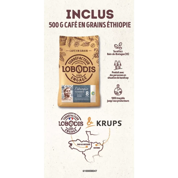 L’Expresso Broyeur KRUPS pack EA8168F2 + 500g café en grains est un ensemble complet pensé pour offrir une expérience café optimale dès la première utilisation. Alliant une machine à expresso automatique robuste et un paquet de café en grains fourni, ce pack s’adresse à ceux qui souhaitent profiter d’un café fraîchement moulu, d’une extraction précise et d’une utilisation intuitive au quotidien.