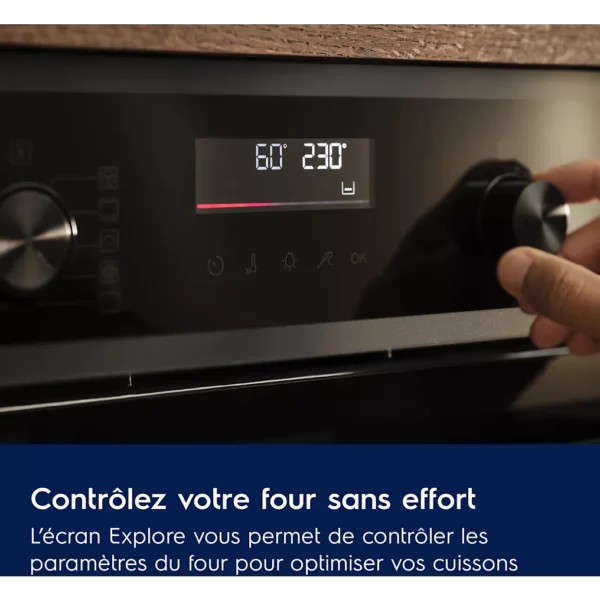 L’interface du Four encastrable ELECTROLUX EOD6P46X SteamBake est pensée pour être simple et intuitive. Les réglages se font en quelques gestes. L’écran affiche clairement le programme, la durée et la température.