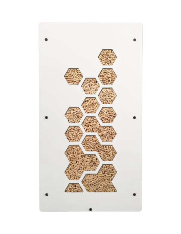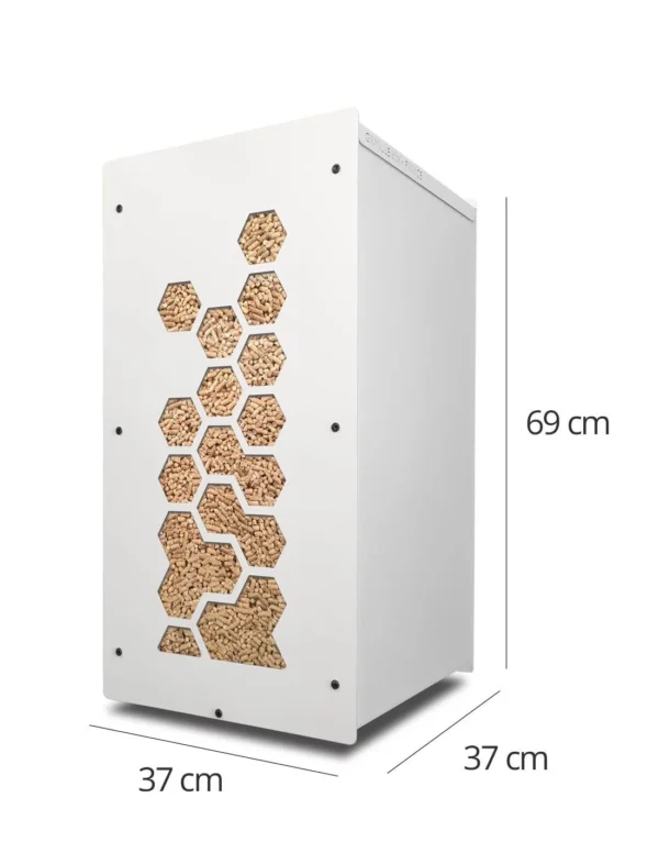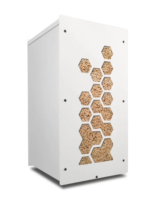 Le coffre à pellets Granulebox Octo Blanc se distingue par son rangement granulés bois design unique. Son inspiration hexagonale, rappelant les alvéoles d’abeilles et la forme de la France, en fait un véritable objet de décoration. Conçu par des designers français, ce meuble de rangement allie esthétisme et fonctionnalité pour répondre à votre besoin de stockage granulés bois.