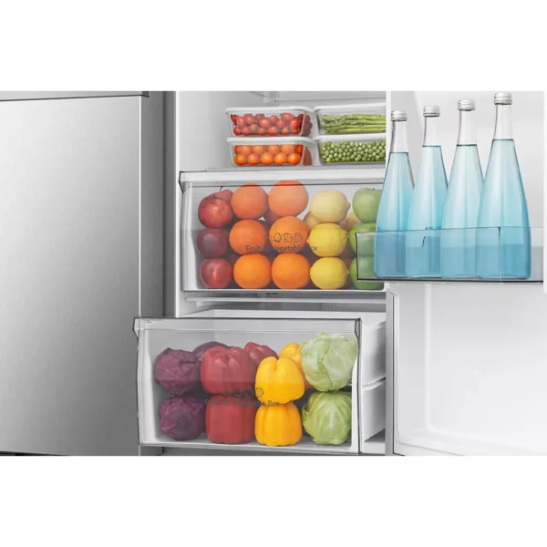 Le compartiment réfrigérateur de 417 litres est équipé de plusieurs clayettes en verre trempé, de bacs à légumes spacieux et de balconnets modulables. Cette organisation permet de ranger facilement bouteilles, produits frais, plats préparés et fruits et légumes. Les tiroirs dédiés permettent de conserver les aliments sensibles comme le fromage, la charcuterie ou les produits laitiers à la bonne température.
