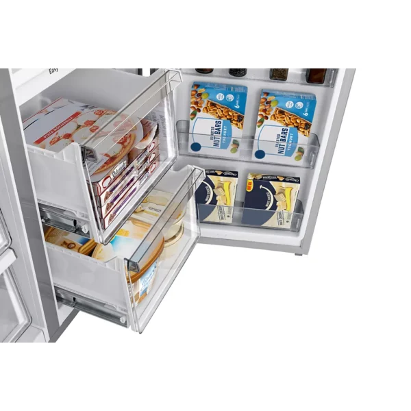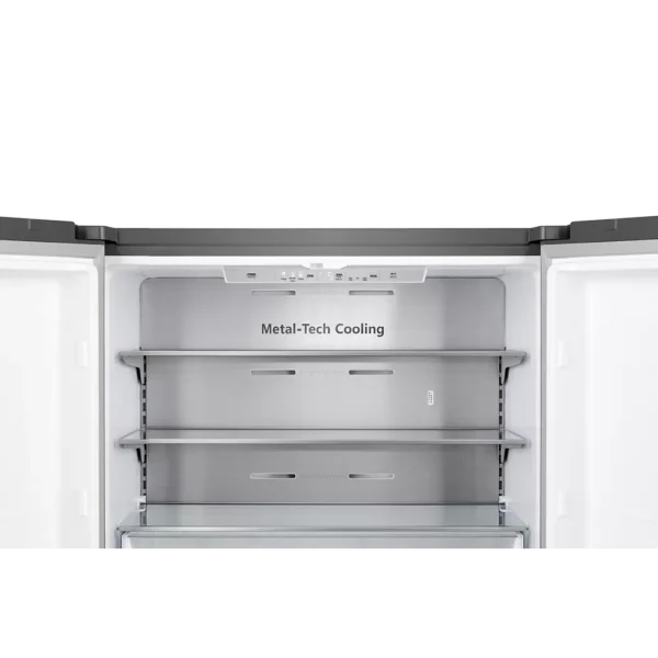 Ce réfrigérateur multi-portes se distingue par un confort d’utilisation pensé pour un usage intensif. L’éclairage intérieur uniforme offre une visibilité parfaite, ce qui rend la recherche des aliments rapide et intuitive, même en fin de journée ou lorsque l’éclairage de la cuisine est faible. Les portes s’ouvrent largement, permettant un accès facile au contenu, même lorsque l’appareil est bien rempli.